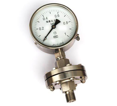 膜片壓力表的作用原理是基于彈性元件(測量系統(tǒng)上膜片)變形。膜片壓力表在被測介質(zhì)的壓力作用下,迫使膜片產(chǎn)生相應(yīng)的彈性變形---位移,借助連桿組經(jīng)傳動機構(gòu)的傳動并予放大,由固定于齒輪上的指針逐將被測值在度盤上指示出來。
